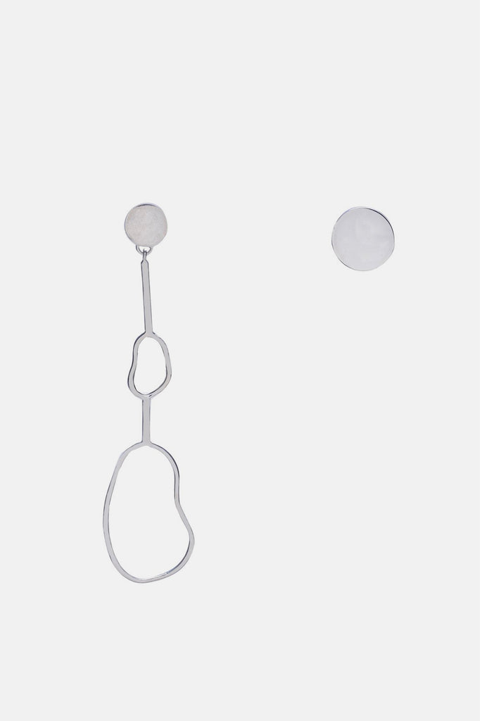 The duster length earring on one side is contrasted with our minimal large Scarpa Concave Stud on the other.